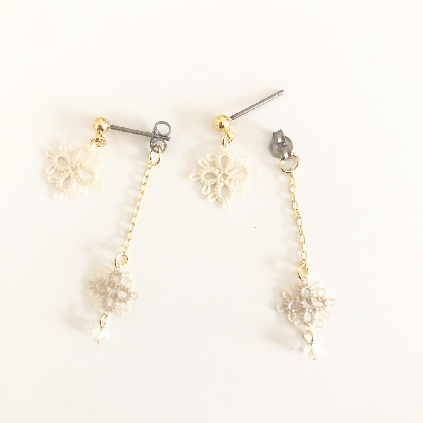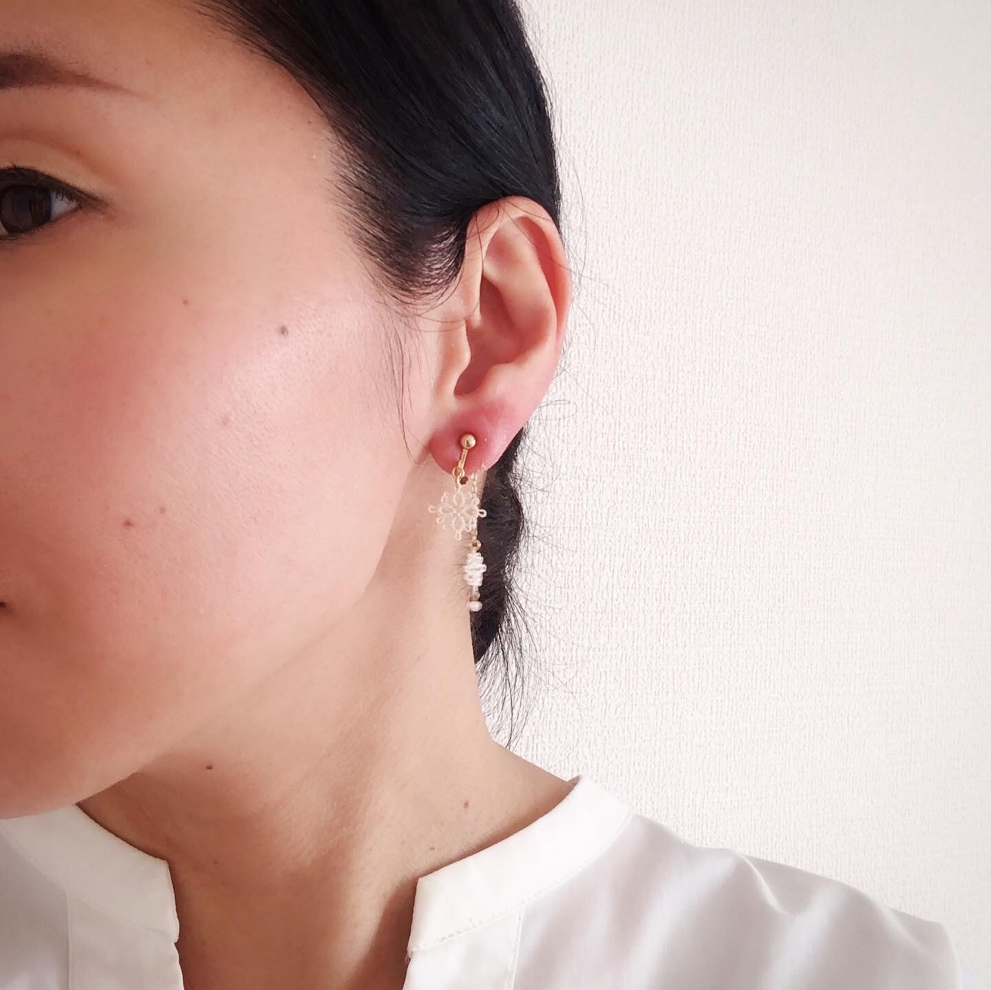 耳の前と後ろで揺れるイヤリング・ピアス。