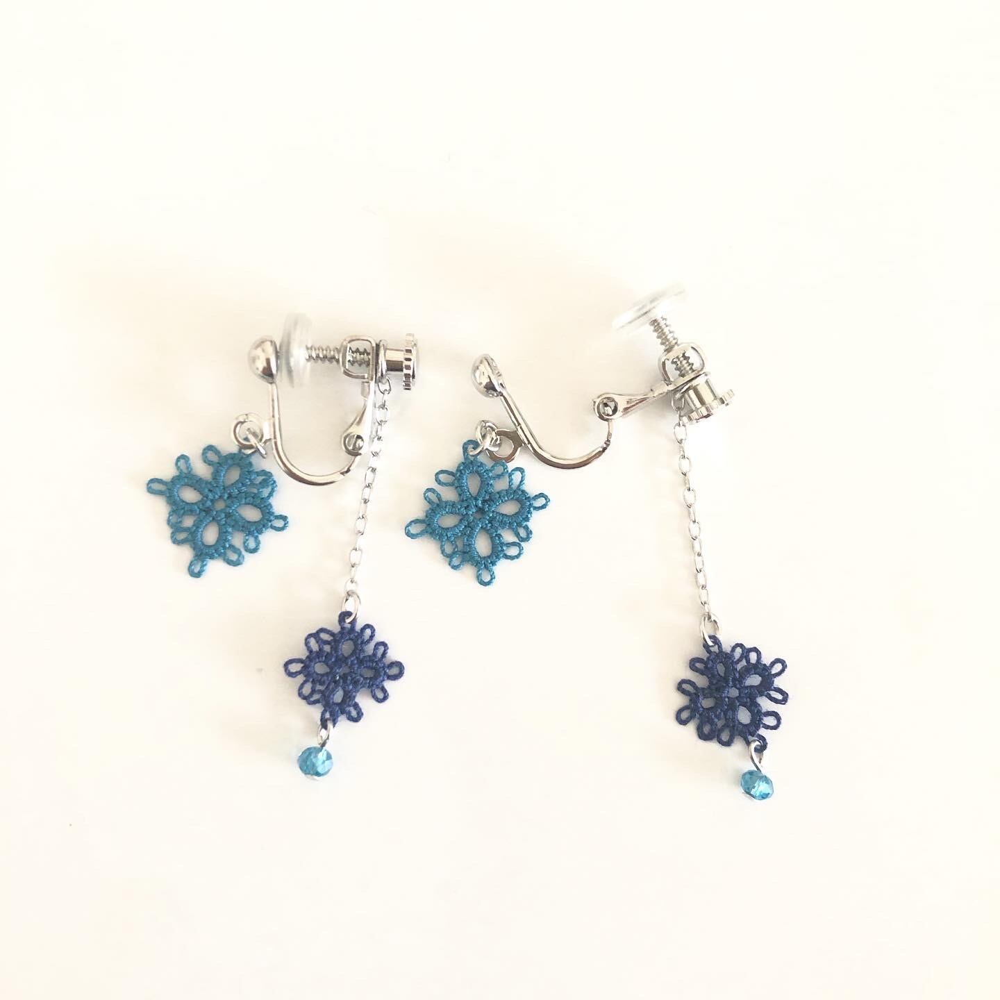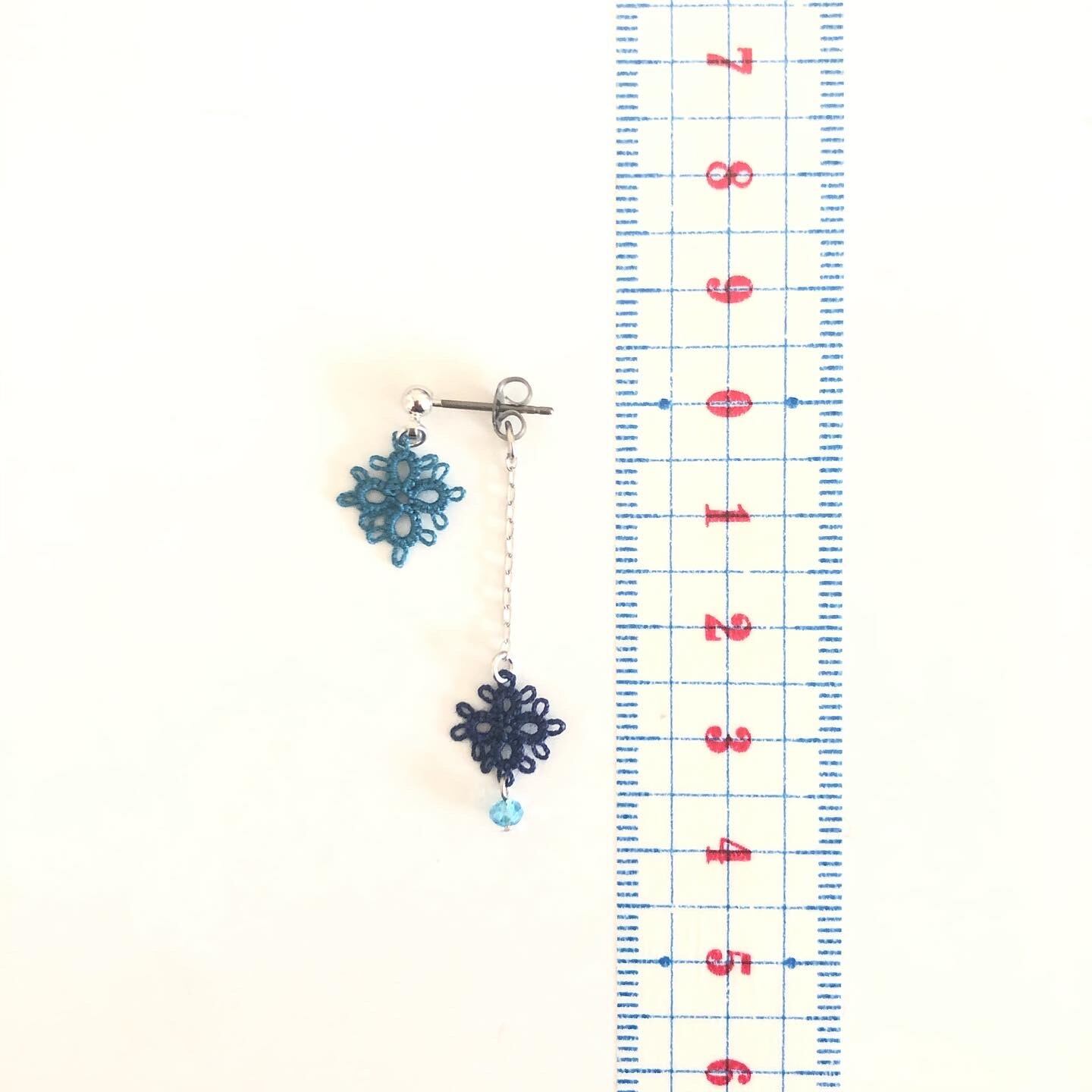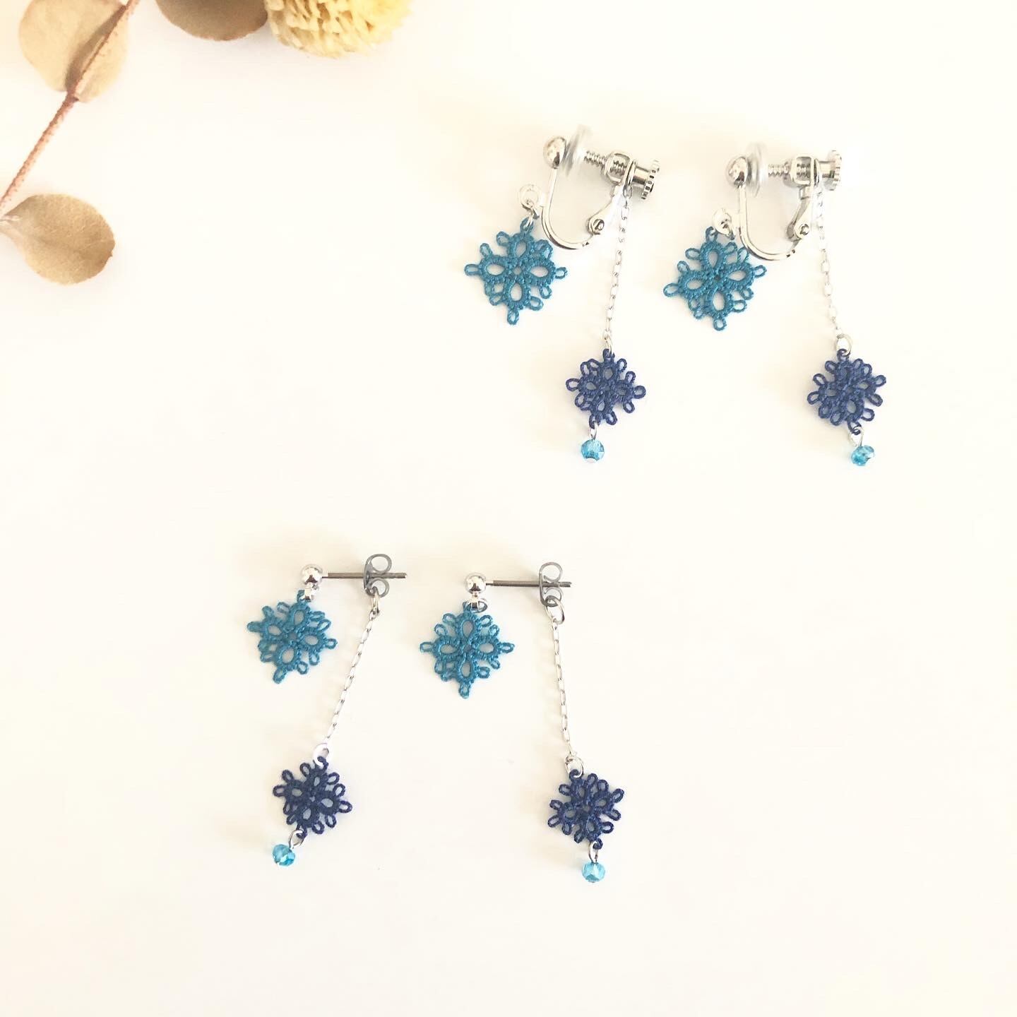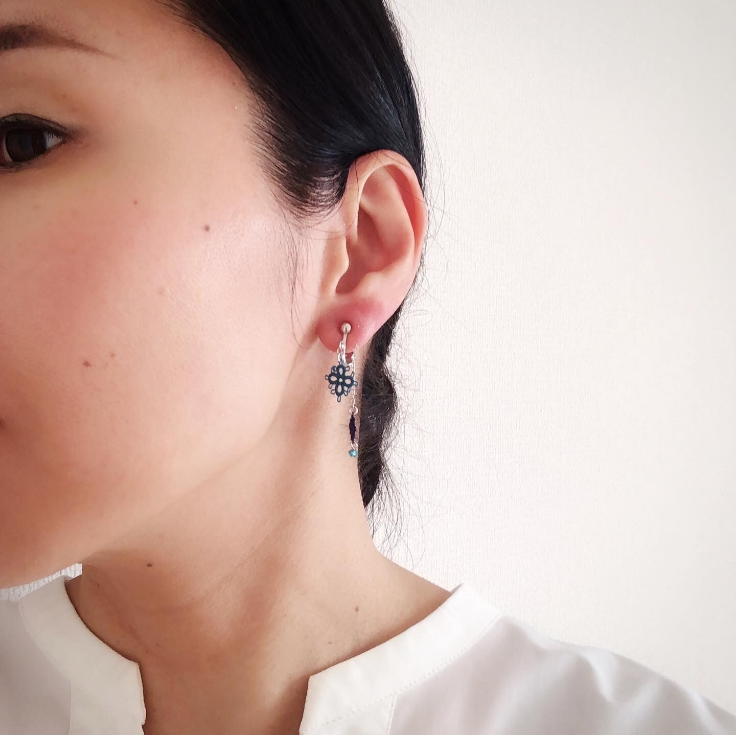 耳の前と後ろで揺れるイヤリング・ピアス。
